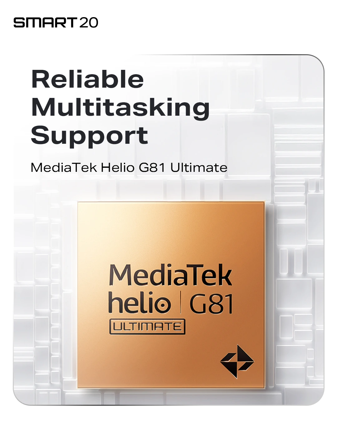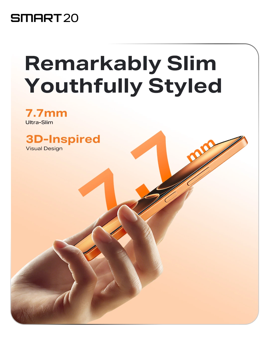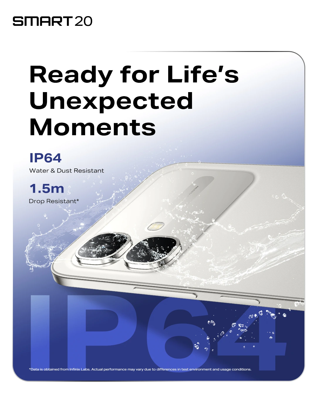 | In the Box | Infinix Smart 20 Handset Charger (10W) USB Type-C cable SIM ejector tool Protective case Pre-applied screen protector Quick start guide Warranty card |